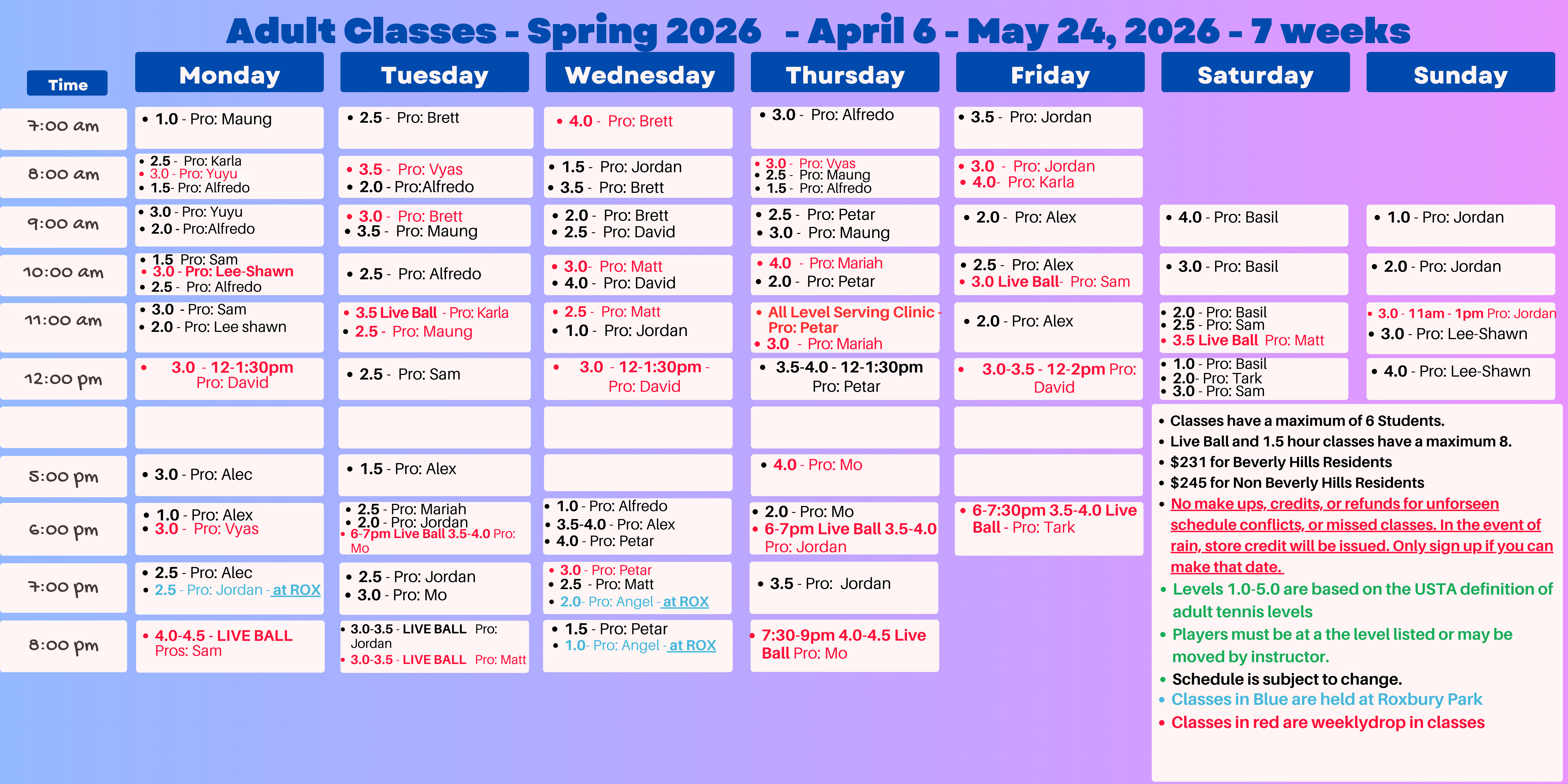 - Levels 1.0-5.0 are based on the USTA definition of adult tennis levels (descriptions and video examples can be found on our Group Classes page).